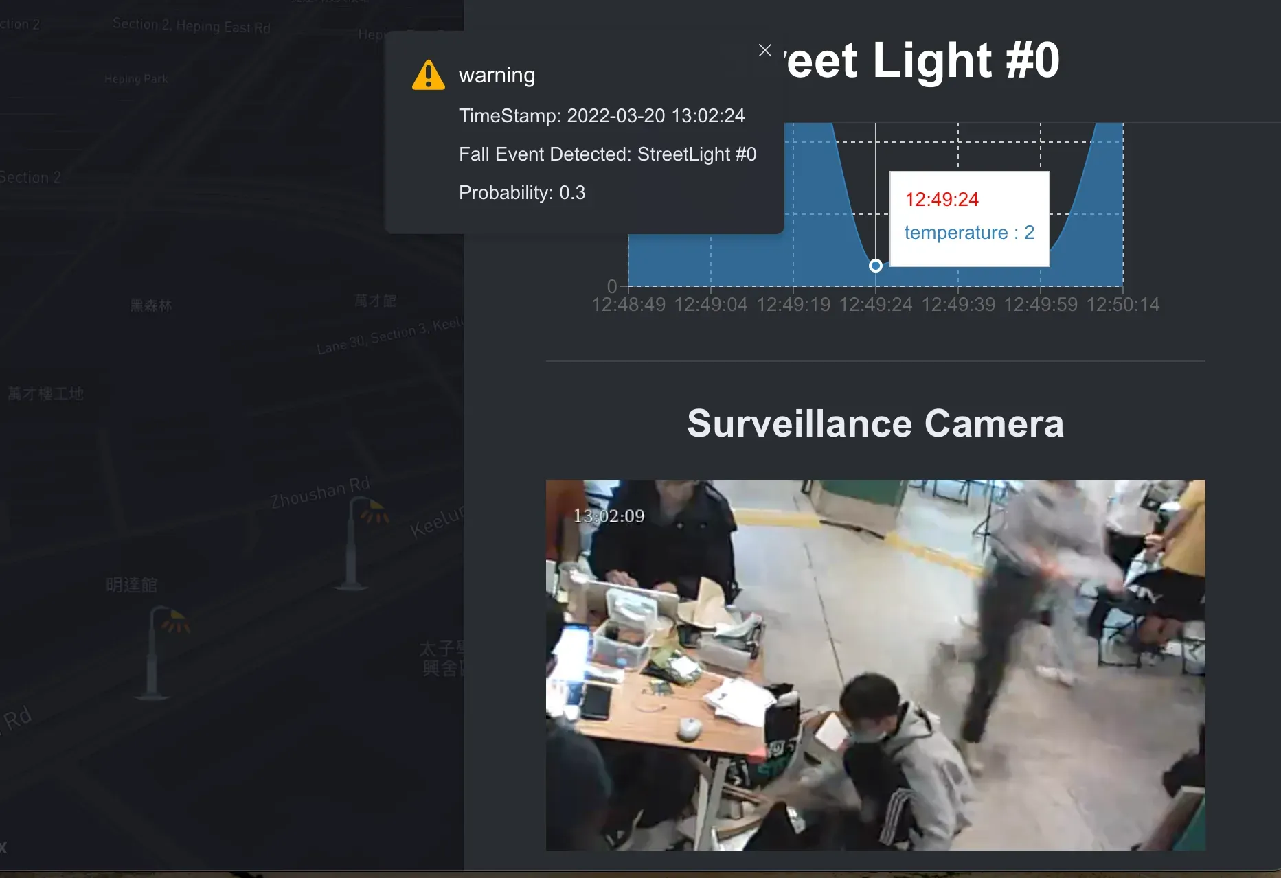 I have made a significant contribution to the project by developing a full stack app that allows users to interact with Light Bringer. Through this app, users can access real-time sensor data from each street light using the MQTT protocol. Furthermore, the app enables users to control the brightness of the streetlights via a user-friendly web interface. Additionally, the surveillance camera integrated into the system serves multiple purposes, such as alerting users to potential danger events and facilitating traffic management. To be more specific, we implement human falling detection model to identify and report possible injury.
